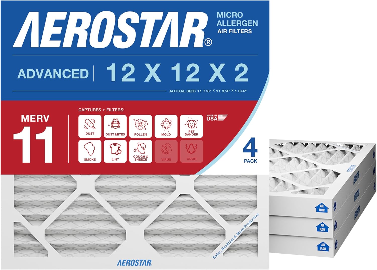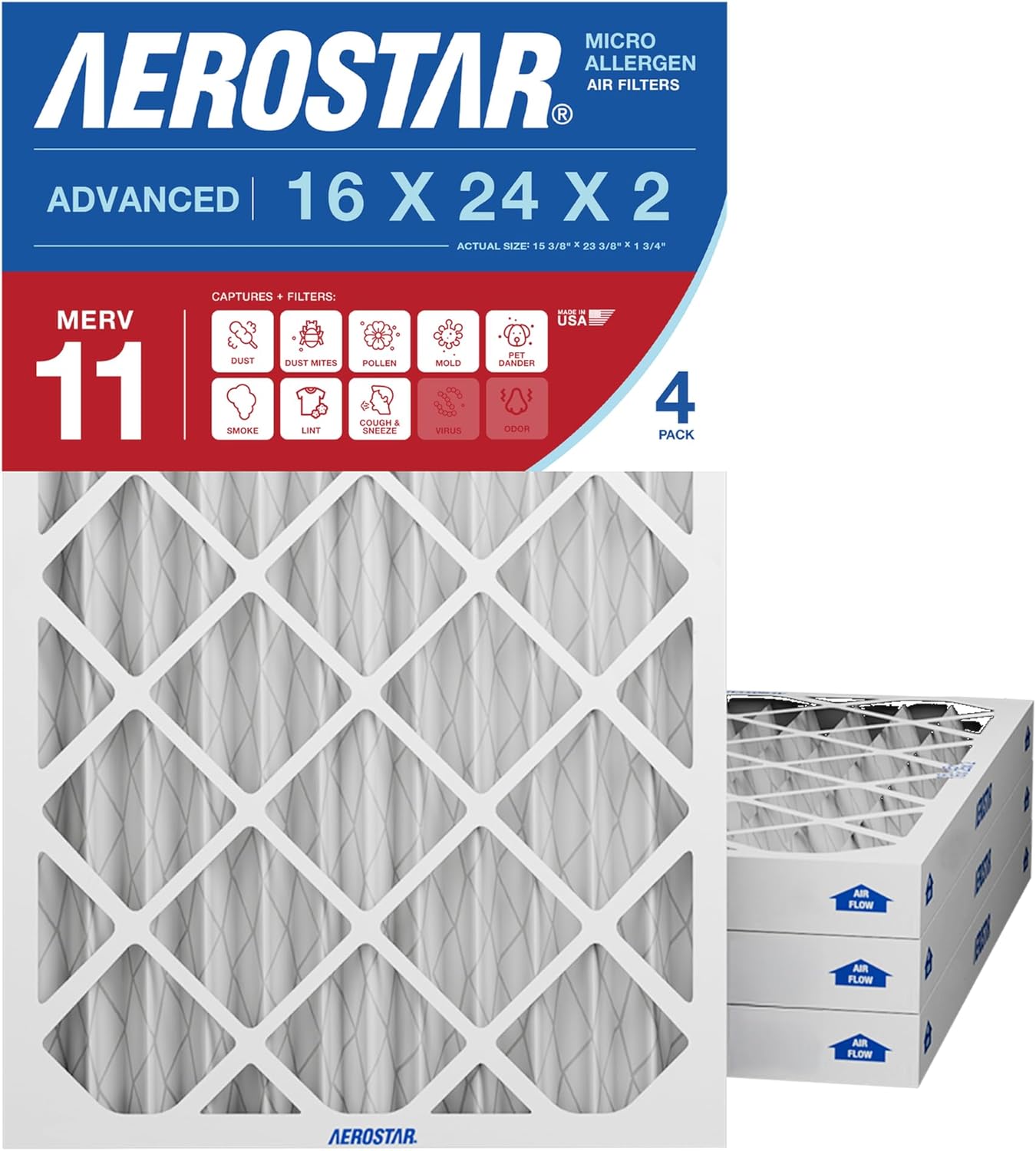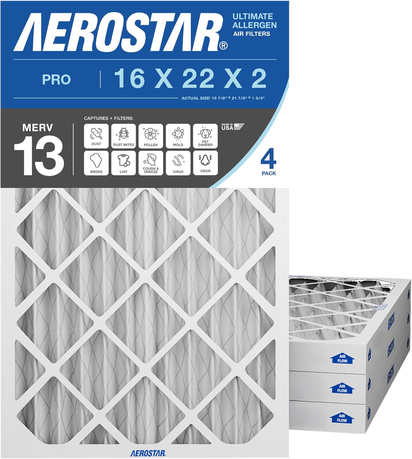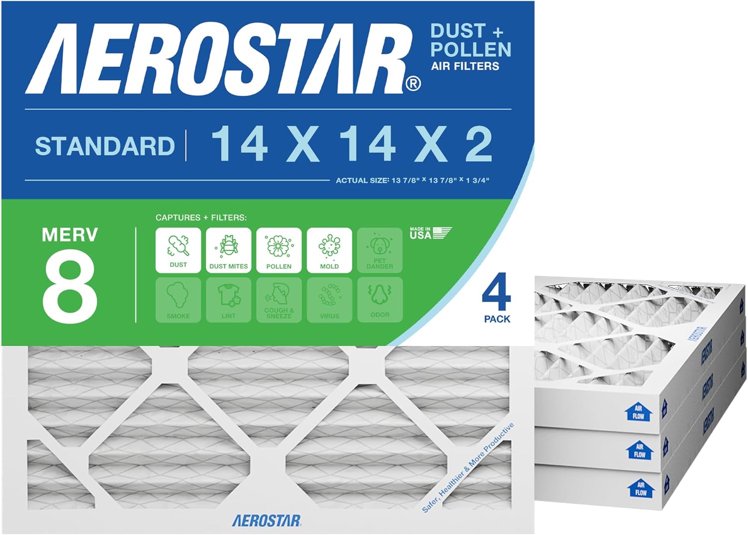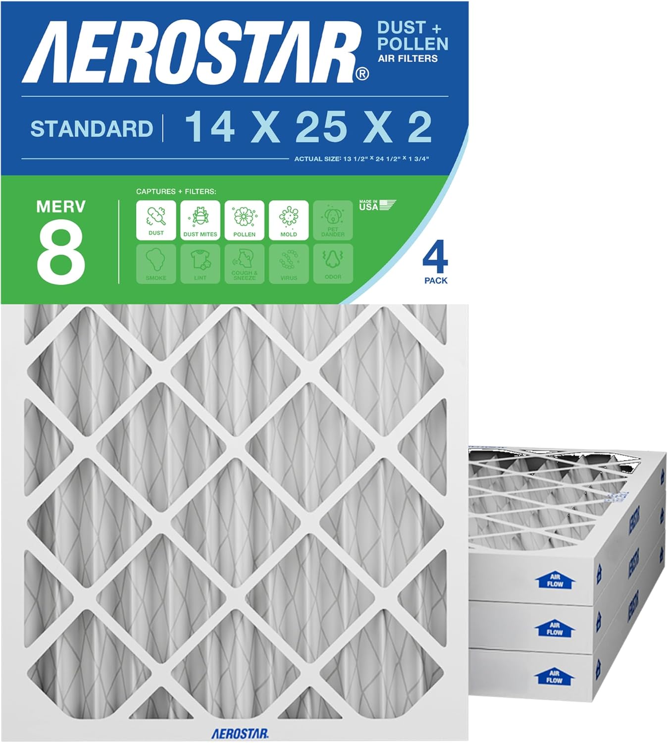 14x25x2 AC and Furnace Air Filter by Aerostar - MERV 13, Box of 4 Pleated MERV 13 Media Comparable to MPR 1500 to 1900 and FPR 10 Designed for Superior Filtration Efficiency Made with electrostatically charged synthetic material that draws and captures allergens between 0.3 – 1.0 microns, including lint, dust mites, spores, pollen, pet dander, fine dust, smoke, viruses, and bacteria. Improve Indoor Air Quality Protect your family and loved ones with clean indoor air quality at home. Aerostar filters are a simple and cost effective step towards a healthier home environment, free of airborne allergens and particles that can trigger various allergy and asthma symptoms. Reduce Cost An Aerostar furnace air filter helps keep your HVAC unit working efficiently by removing dirt and reducing strain on the motor. When your unit runs properly, it consumes less energy, requires less maintenance and will have a longer life. These factors will have an impact on your utility bill and maintenance costs. It is recommended that you change the filter every 60 to 90 days during normal times of year but increase frequency to 30 days during peak summer and winter months when your unit is working the hardest. Aerostar filters are manufactured in the USA by Filtration Group, a world-leading manufacturer and supplier of filtration solutions for residential, commercial and industrial applications. The Aerostar brand is known for constantly innovating and improving their technology to help make filtration more efficient, effective and environmentally friendly every day. What's in the Box Box of four Aerostar MERV 13 Pleated Furnace Air Filters. MERV 13 filters are comparable to MPR 1500 to 1900 and FPR 10.Actual Size: 13 1/2" x 24 1/2" x 1 3/4", Nominal Size: 14 x 25 x 2 , Size: 14x25x2, AC and Furnace Air Filters