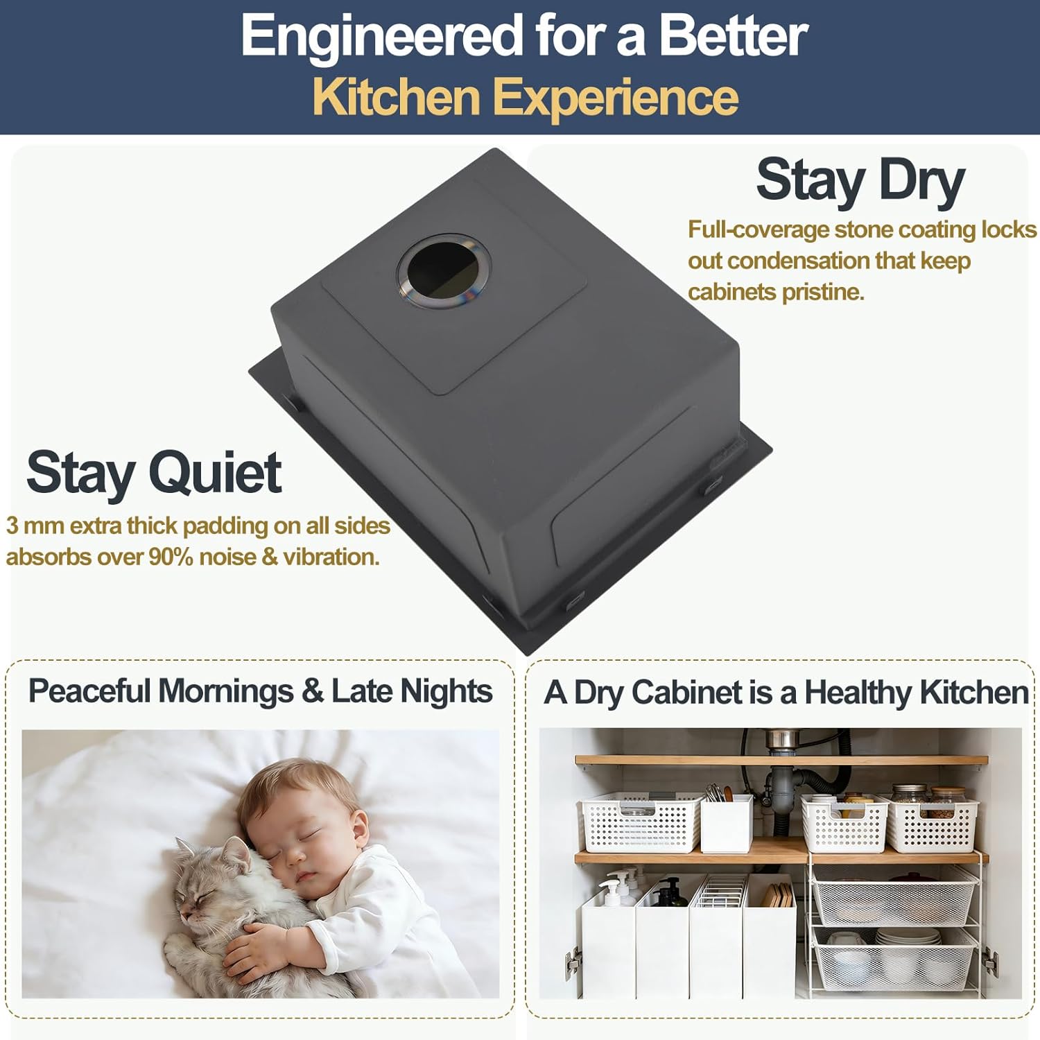 Professional-Grade Bar Sink for Elevated Home Entertaining Crafted from premium 16-gauge T304 stainless steel—the same material trusted in commercial bars and high-end hospitality venues—the Professional Bar Sink delivers uncompromising durability and refined aesthetics. Its reinforced construction withstands daily use with bar tools, shakers, and glassware, while advanced sound-dampening technology ensures quiet operation, maintaining the ambiance of your home entertainment space. Designed to perform flawlessly year after year, this black bar sink brings professional functionality to your personal bar area. Optimized Dimensions with Dedicated Bar Accessories Measuring 15"x20"x10" (requires minimum 18" cabinet width), this bar sink arrives fully equipped with bar-specific accessories: a fitted cutting board for preparing garnishes over the kichen bar sink, a collapsible rack for drying glassware and organizing tools, protective bottom grids, a removable strainer basket to catch fruit peels and debris, plus a precision template and mounting hardware for seamless installation. Integrated Workstation Design for Efficient Workflow Featuring front and rear sliding tracks, this drop in bar sink transforms into a functional prep station. All accessories glide smoothly between prep, rinse, and dry zones, keeping garnishes, tools, and glassware organized within reach. This streamlined setup maximizes even compact bar areas, offering the efficiency of a professional bar station without sacrificing style or space. Quiet Operation with Advanced Drainage System Engineered with a moisture-resistant undercoating to protect cabinetry and thick sound-absorbing padding for near-silent cleaning, this 15 inch bar sink is built to preserve both your home and your peace of mind. The 3.5" drain accommodates standard disposals, while the subtly sloped basin ensures quick water flow—no standing water between mixing rounds. Versatile for Multiple Entertainment Settings Ideal for home wet bars, kitchen islands, apartment beverage centers, yachts, and entertainment rooms, the Bar Sink combines elegant design with professional functionality. Wherever fine drinks are crafted and guests are welcomed, this sink provides the durable, stylish foundation for unforgettable moments.