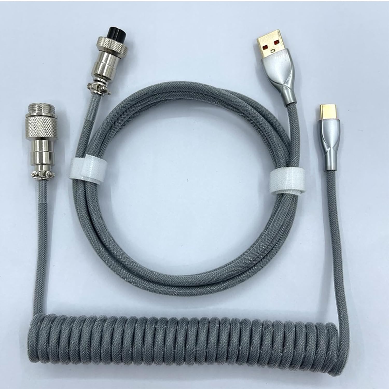 Specification Product Parameters Product Name: Mechanical Keyboard Coil Cable Product Material: Braided Thread+PU Interface type: Type-C to USB Cable length: approximately 1.8m (unstretched); 3 meters (stretch) Application: Compatible with all Type-C USB mechanical keyboards Color: As shown in the picture (can be used in combination with different colors) The package includes: 1 piece [2 segments of wire totaling 3 meters] DIY aviation plug keyboard data cable