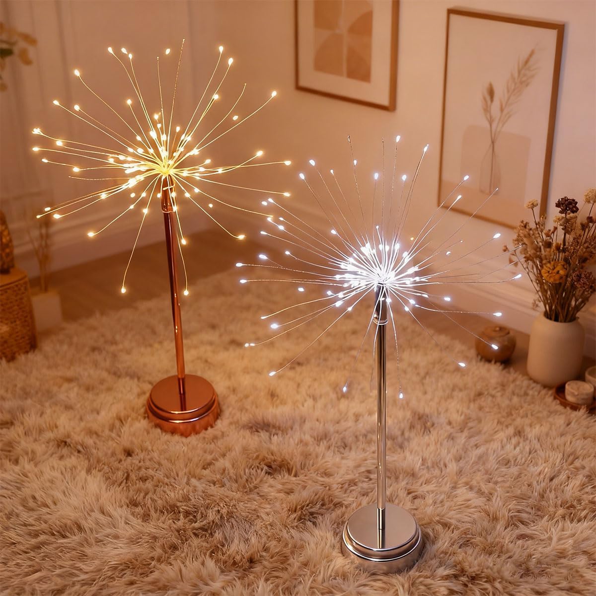 OUR Nest and Flowers Table Lights exquisitely designed metal star table light emanates a soft, honeyed glow that wraps your space in comfort. Its warm, gentle radiance transforms ordinary moments into special ones, whether you’re hosting a festive holiday feast, a cozy winter get-together, or just craving a touch of warmth in your daily living nook. It’s not just a light; it’s a little piece of magic for your table. Product Name:Nest and Flowers Table Fireworks Lights Dimensions: 3.74*3.74*11.41in Illuminated Diameter: 7" (17 cm) Net Weight: 185g Light Source: LED Light Color: Warm White Power Supply: USB / 3 AA Batteries (Batteries Not Included) Package Contents:2 PCS / 4 PCS / 6 PCS/8 PCS *(Optional) Warm Notes 1. Manual measurement may result in a 1-2cm error, which is within the normal range. 2. Due to differences in monitor resolution and lighting conditions, the actual color of the product may slightly differ from the pictures. Your understanding is greatly appreciated.